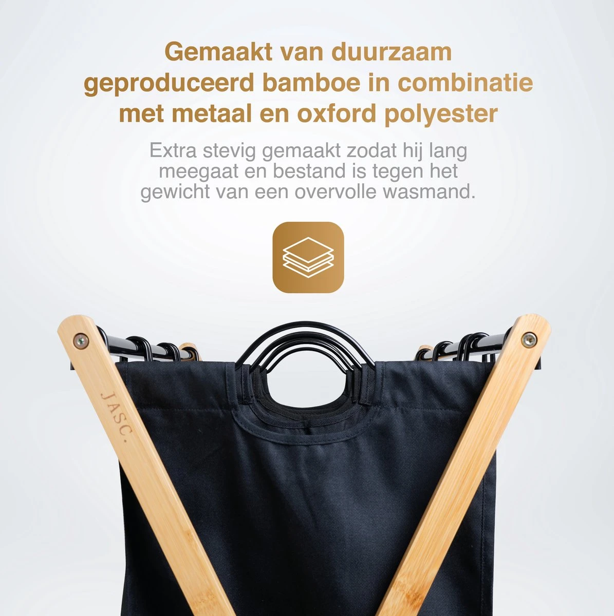 De wasmand is gemaakt van twee duurzame materialen: bamboe, Oxford met vuil en waterafstotende coating. Het bamboe frame zorgt ervoor dat deze robuust is en niet na een aantal maanden uit elkaar valt. De waszakken zijn van Oxford, een weeftechniek van polyester waarbij een coating is toegevoegd zodat de wasmand 100% water- vuilafstotend. Dit help met de absorbering van vervelende geurtjes van de vuile was. Je kunt de waszakken eenvoudig afnemen met een doekje.