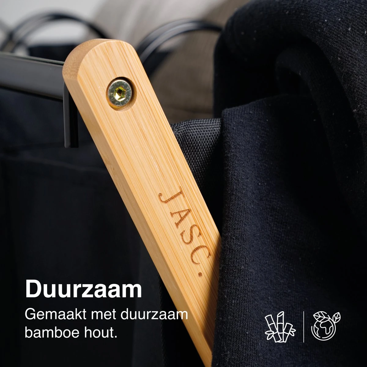 De stijlvolle wasmand met 3 uitneembare vakken van JASC is onmisbaar in elk huis! Ben je het zat om een enkele sok tegen te komen nadat de was al in de wasmachine zit? Wil je niet langer met bergen was door het huis lopen, alleen maar om er achter te komen dat je de helft hebt laten vallen? Dan is deze wasmand de uitkomst! Dankzij het hedendaagse design past deze wasmand thuis in ieder washok of iedere badkamer. De 3 waszakken zijn individueel uitneembaar en zo mee te nemen naar de wasmachine of een slaapkamer. Klaar met de was inladen? Dan hang je de waszak binnen 1 seconden terug in het frame. Erg handig en bespaart tijd!
